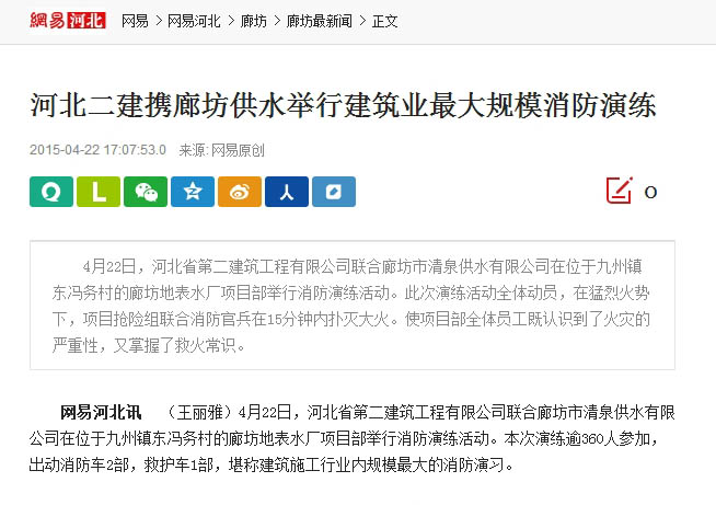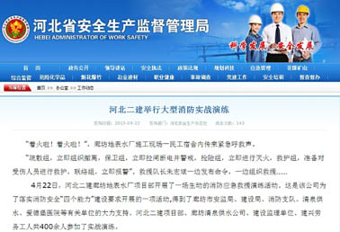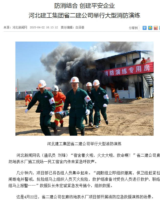 河北新闻网等多家媒体报道我消防实战演练 来源: 修改时间:2015.04.23 浏览:7320 河北新闻网等多家媒体报道我消防实战演练 2015年4月22日,公司在廊坊地表水厂组织了一次施工现场消防应急救援实战演练。来自业主、监理和劳务队的400多人参加了此次活动。 当日,河北新闻网、河北安全生产杂志、网易河北、廊坊电视台、廊坊日报等多家新闻媒体对此进行了报道。(闫子明) 河北二建:上一条 返回列表 下一条
