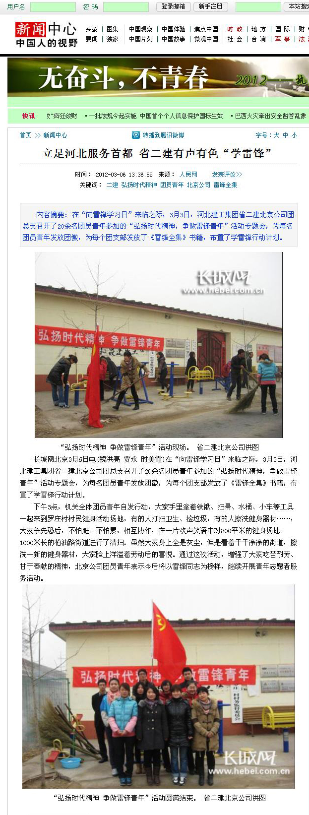 长城网人民网等多家媒体报道我公司青年“学雷锋”活动 来源: 修改时间:2013.02.01 浏览:6274 长城网等多家媒体 报道我公司青年“学雷锋”活动 2012年3月6日,长城网以《立足河北服务首都 省二建有声有色“学雷锋”》为题图文报道我公司青年“学雷锋”活动情况。随后,人民网、中国网、中国日报网、网易网、21世纪新闻网等多家媒体转载了这一报道。 上一条 返回列表 河北二建:下一条