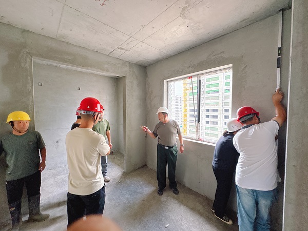 “质量月”期间,项目部组织开展抹灰工程质量样板间验收活动。项目负责人、技术质量部门人员、监理单位代表及施工班组负责人组成验收组共同参与此次活动。活动中,验收组首先对预先施工完成的抹灰样板墙进行严格、细致地检查,并严格依据设计图纸、施工规范及质量标准,从墙面垂直度、平整度、阴阳角方正度,到观感质量、材料配合比、工序流程合规性等维度,进行全方位核查与专业评估,确保样板质量达标,为后续大面积施工树立质量标杆。